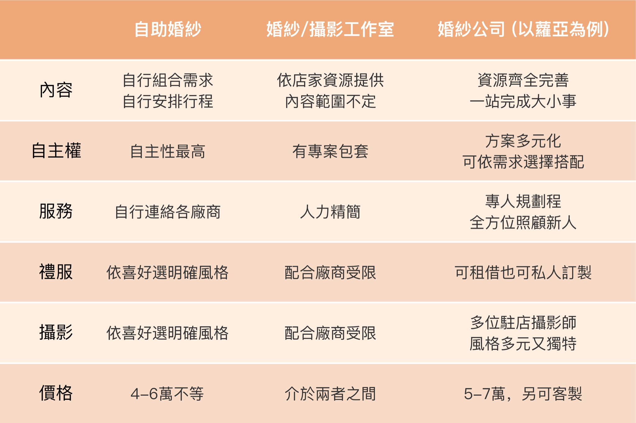 看完了婚紗包套內容和注意事項,蘿亞更幫你整理婚紗包套項目表,讓你可以快速了解自助婚紗/工作室/婚紗公司婚紗價位不同,掌握這些資訊,你就離「輕鬆籌備婚禮」不遠了!